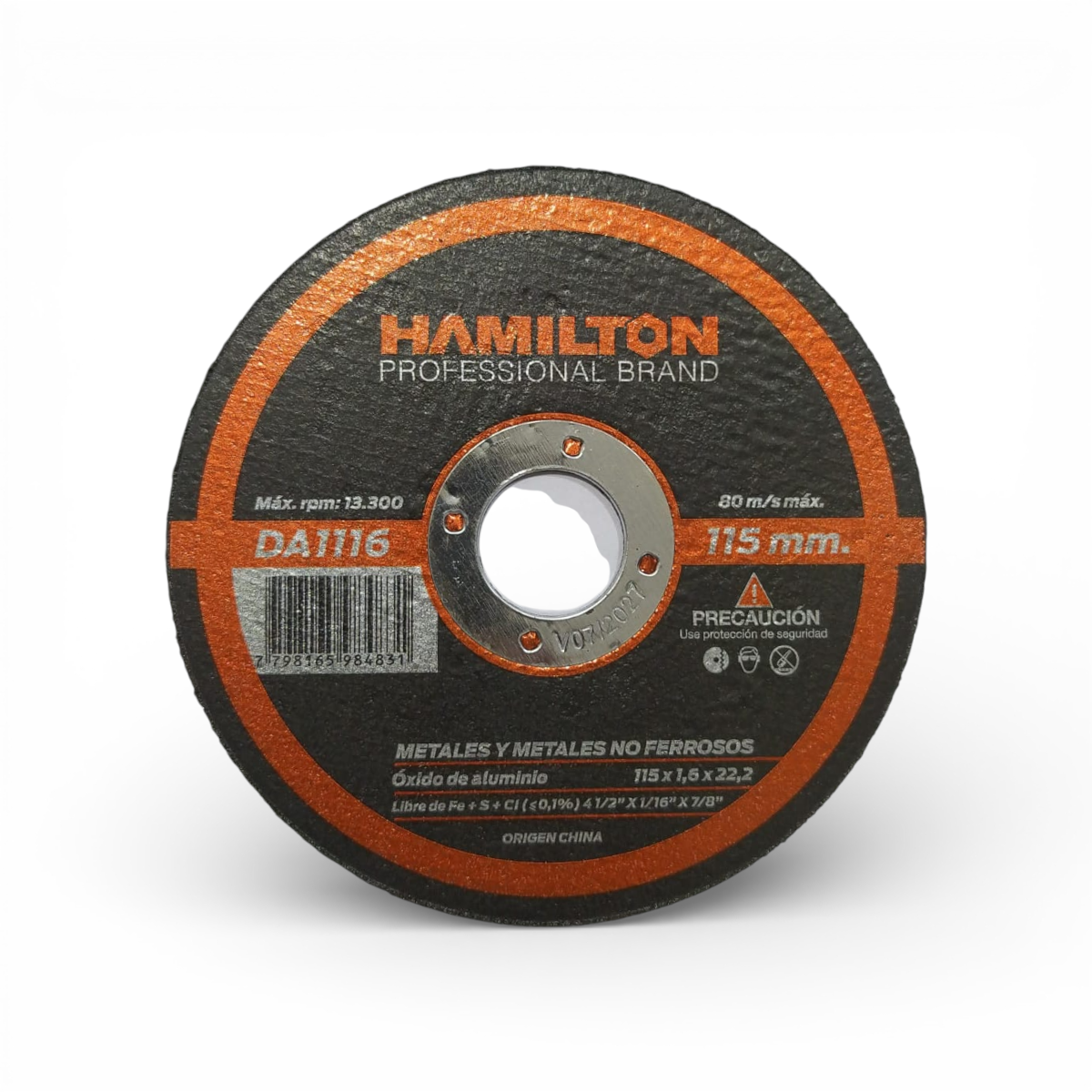 Disco Hamilton abrasivo plano para metal de 115×1,6×22,2 mm. Corte fino, rápido y preciso en acero y hierro. Ideal para amoladora 4 1/2”, con excelente durabilidad y estabilidad.