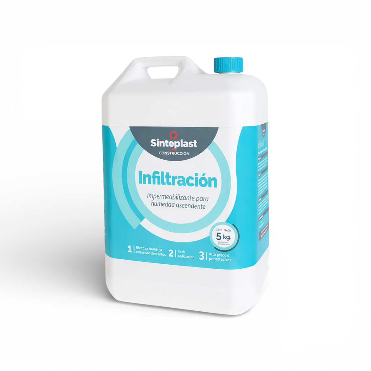 Impermeabilizante por infiltración Sinteplast de 5 litros, ideal para tratar la humedad ascendente en muros y paredes. Penetra en profundidad, bloquea la capilaridad y previene la reaparición de humedad.
